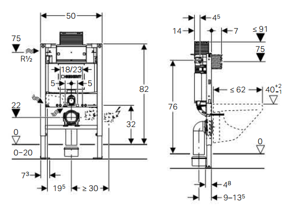 Rama z otworami ø 9 mm do zamocowania w drewnianej ścianie szkieletowej-Samonośny-Rama o profilu C 4x4 cm-Rama malowana proszkowo, niebieski ultramaryna-Nóżki regulowane o 5 cm-Obrotowa płyta pod nogę, do montażu w profilach UW50 i UW75-Rama pod wsporniki w miskach toaletowych o małej powierzchni przylegania-Wsporniki pod nogi, ocynkowane, regulowane w zakresie od 0-20 cm-Wsporniki pod nogi z zabezpieczeniem antypoślizgowym-Kolano przyłaczeniowe z możliwością montażu na różnych głębokościach bez użycia narzędzi, zakres regulacji 45 mm-Mocowanie kolana odpływowego izolowane akustycznie-Spłuczka podtynkowa z przyciskiem u góry lub z przodu, z izolacją przeciwroszeniową-Spłukiwanie dwudzielne przyciskami Omega20, Omega30 oraz Omega60-Przy ustawieniach fabrycznych ponowne spłukiwanie możliwe natychmiast-Prace montażowe i serwisowe w obrębie spłuczki podtynkowej bez użycia narzędzi-Przyłacze wody z boku lub z tyłu, z lewej strony-Obudowa ochronna zabezpiecza otwór serwisowy przed wilgocią i zabrudzeniem-Obudowa ochronna otworu serwisowego z możliwością przycięcia-Wyposażona w rurkę osłonową do dopływu wody do podłączania urządzeń Geberit AquaClean