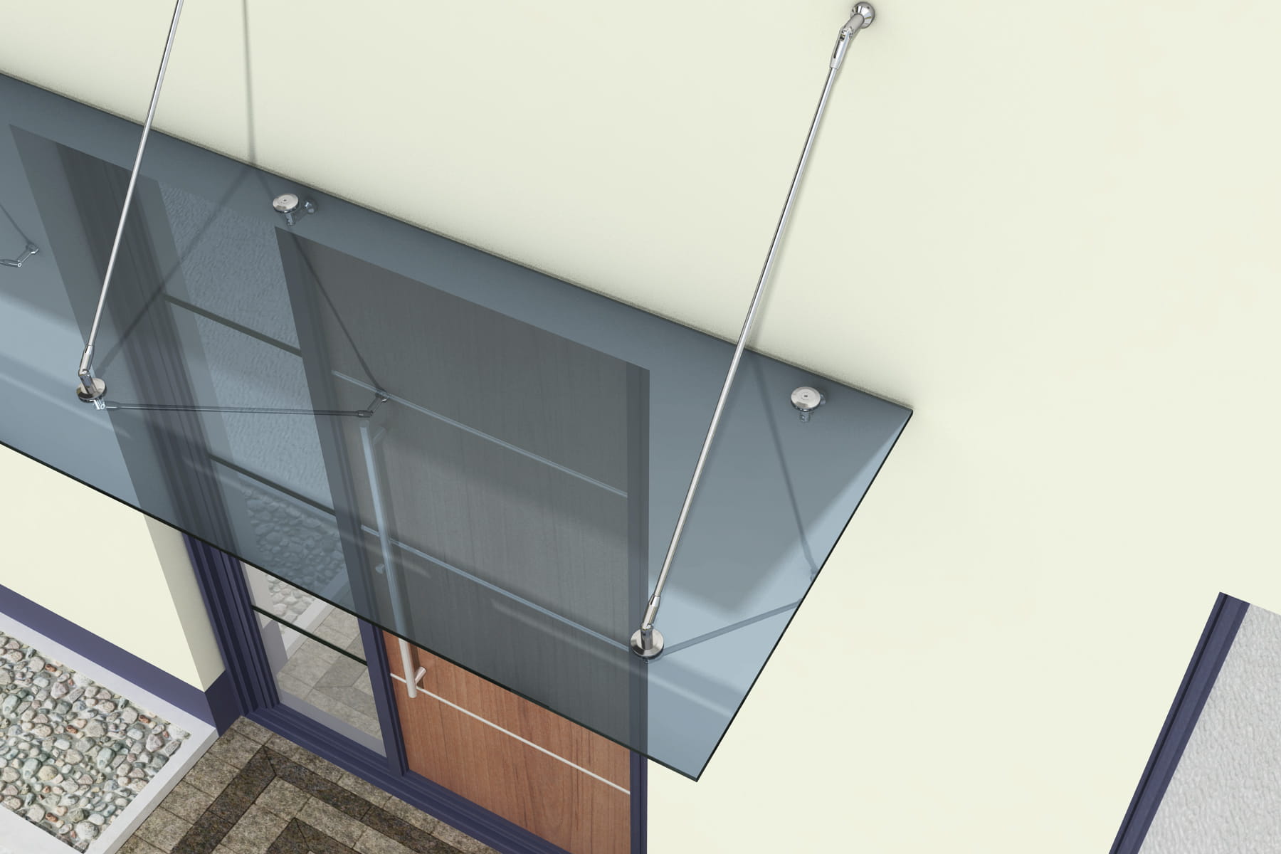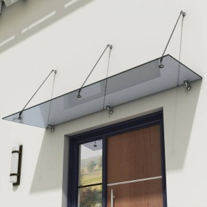 Daszek Szklany składa się z: 2 tafli szkła (laminowane 13mm hartowane szkło bezpieczne ESG/VSG/EVA FL6.6.2 ), dźwigary ze stali nierdzewnej (dla tafli szkła od 120 do 200 cm znajdują się dwa dźwigary a od 250 do 300 cm trzy dźwigary) i zestawu mocujący - śruby i kołki do betonowych ścian.