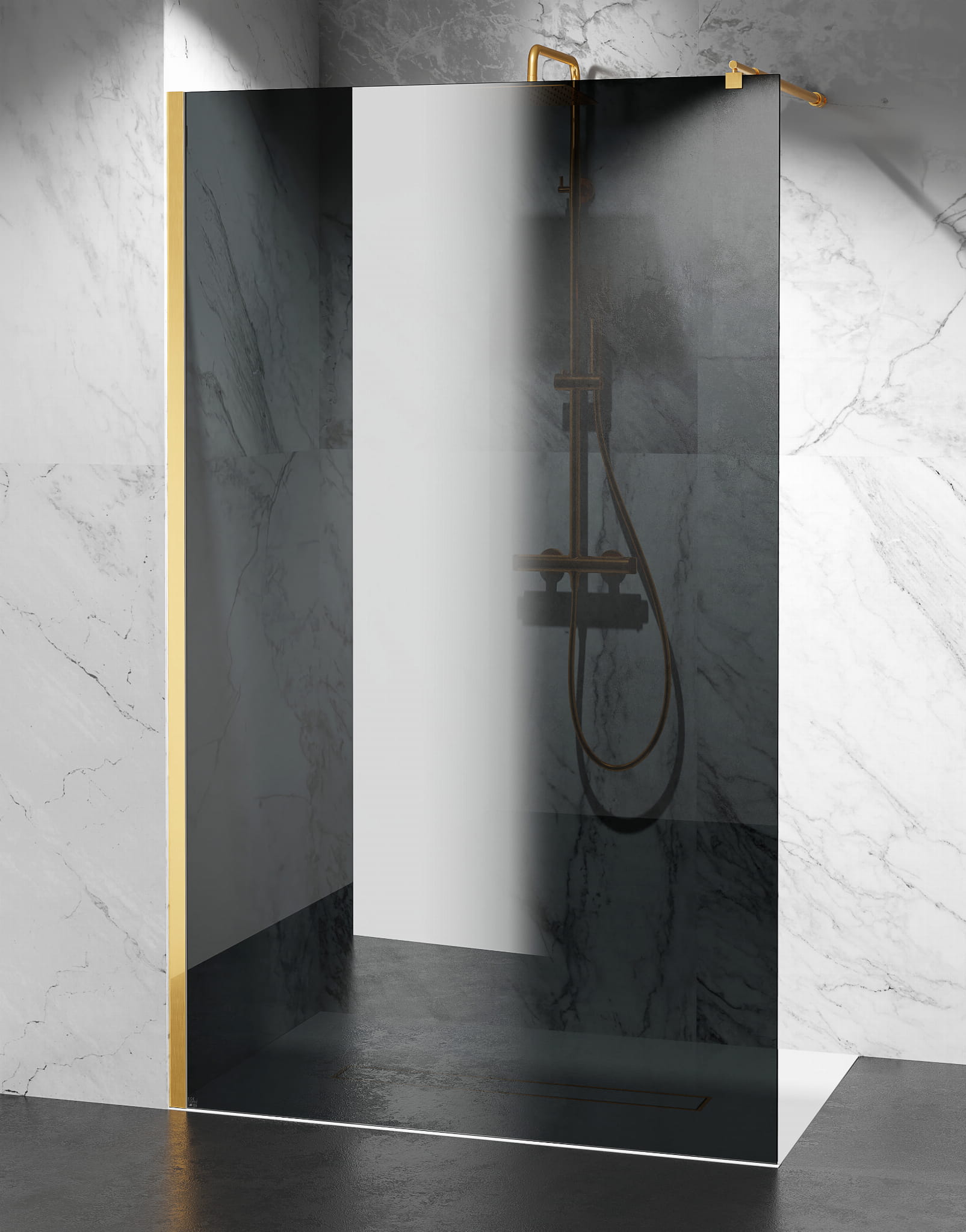 Szyba prysznicowa Walk-In, szkło grafitowe przyciemniane, kolor okuć: złoty mat