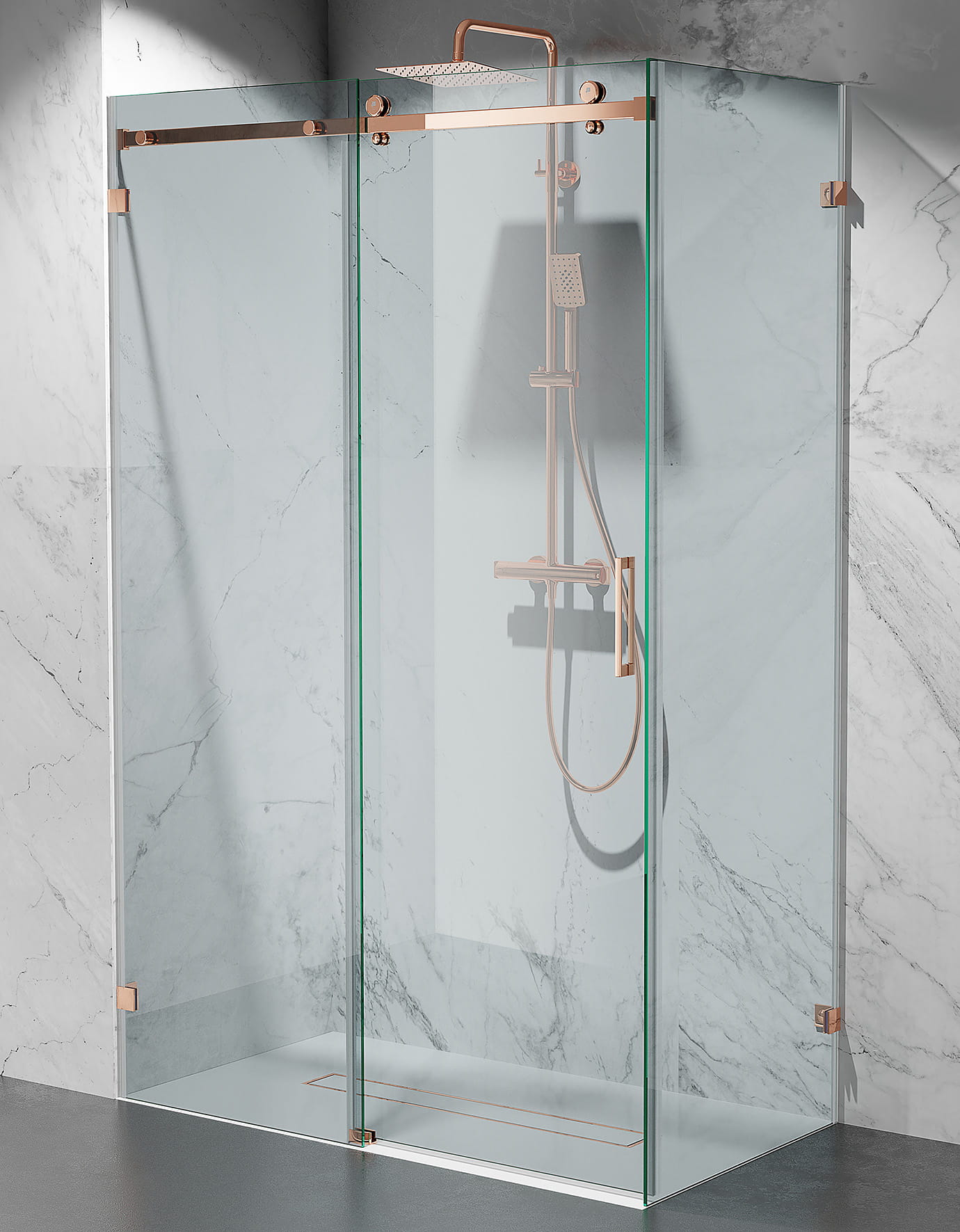 Kabina Prysznicowa Przesuwna Bezprofilowa, szkło transparentne, okucia złoty róż